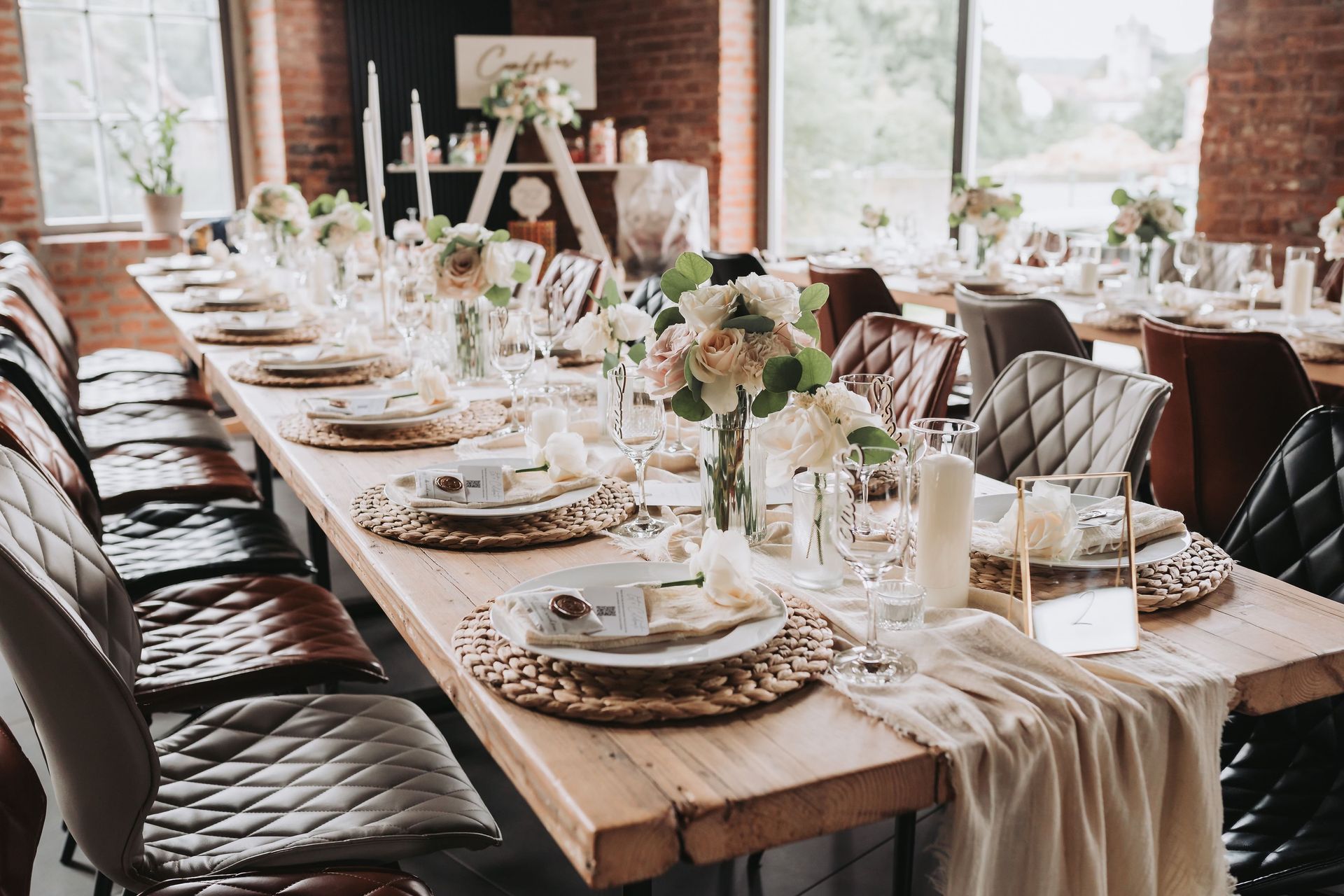 Alle Dekorationsartikel, die Ihr seht, könnt Ihr bei uns leihen. Sowohl die Kerzenständer, Vasen, Servietten mit passenden Tischläufern als auch Tischsets und vieles mehr. Auch die Floristik inklusive Accessoires wie Brautstrauß und Anstecksträußchen übernehmen wir gerne!🥰🌸