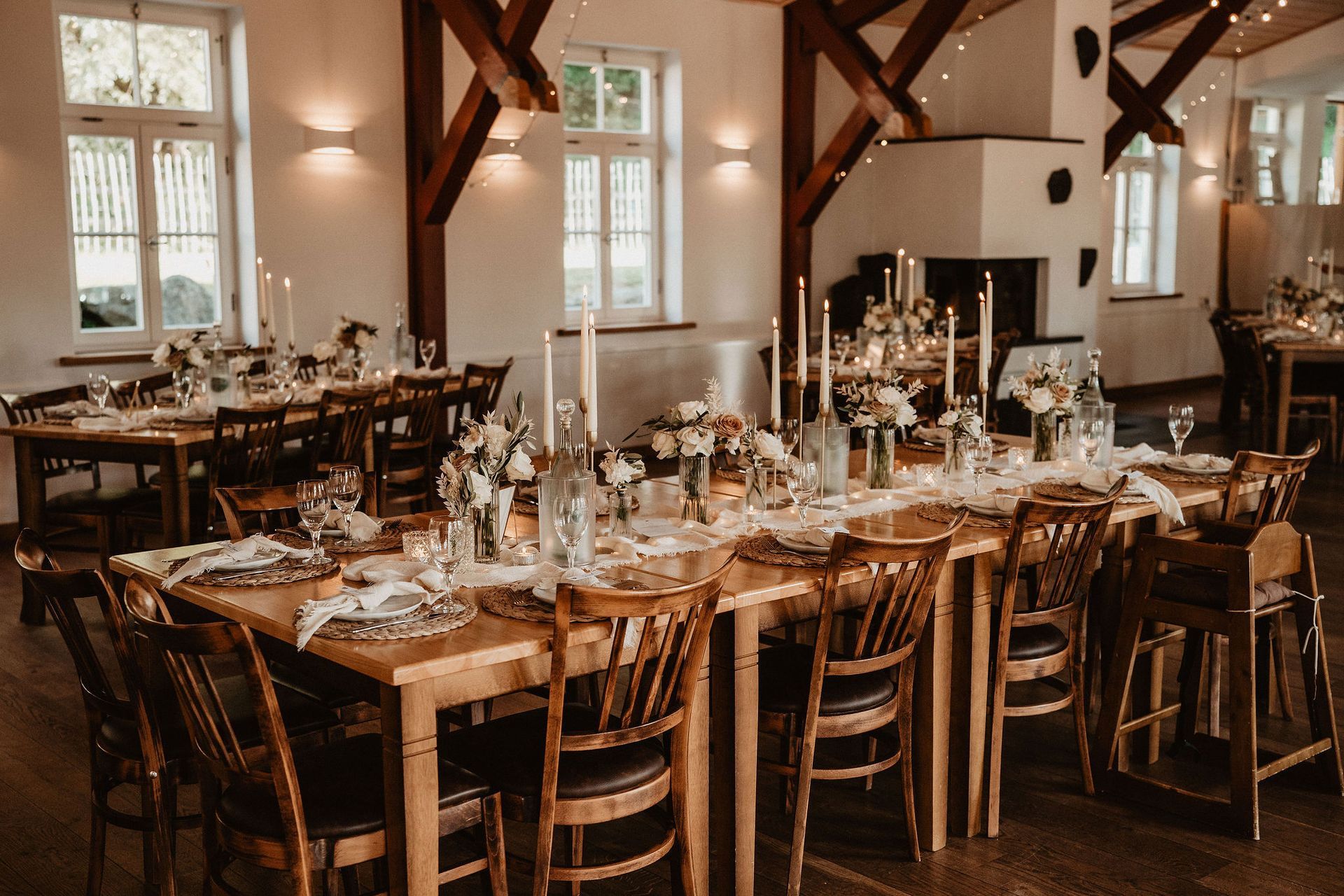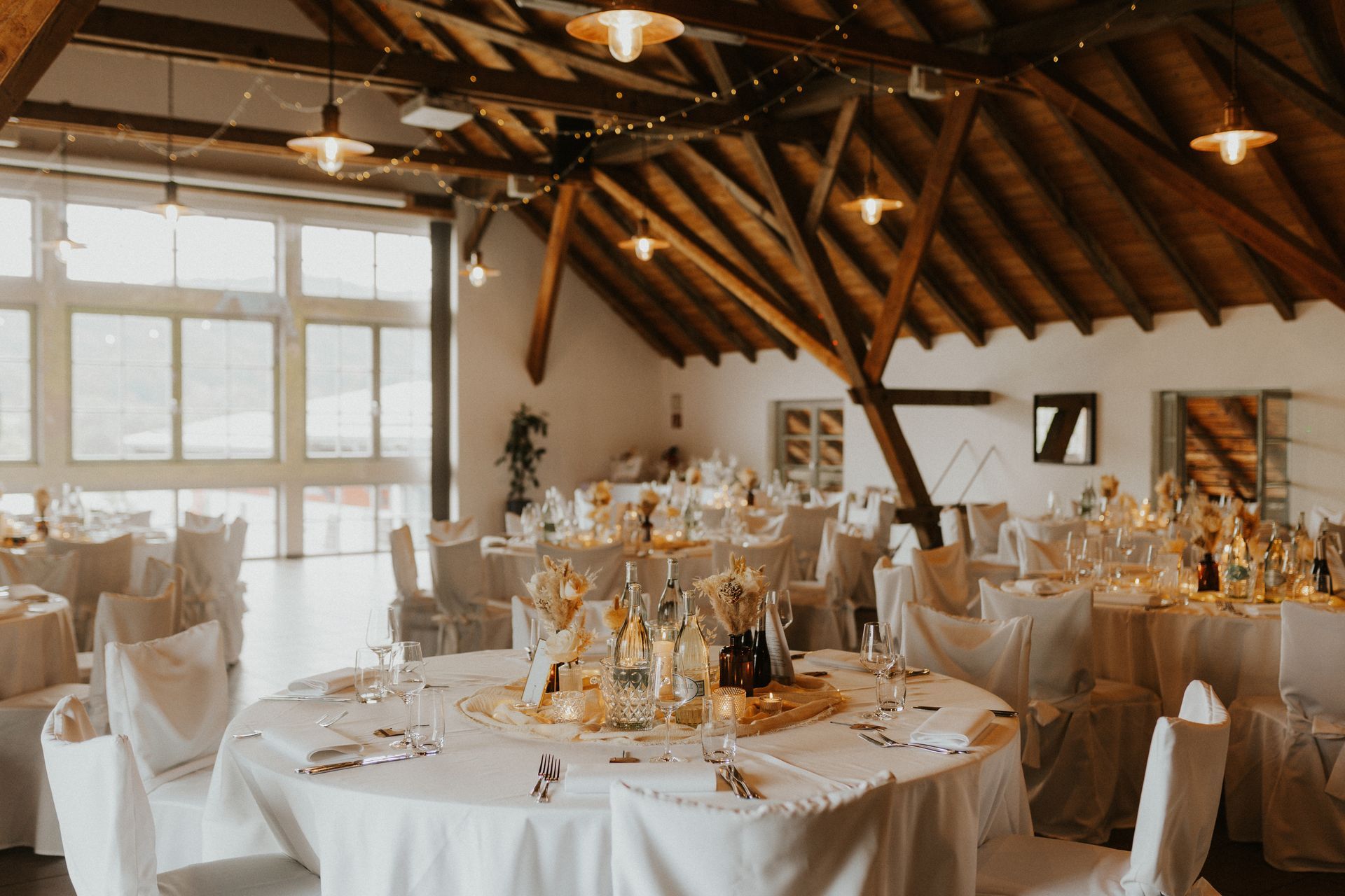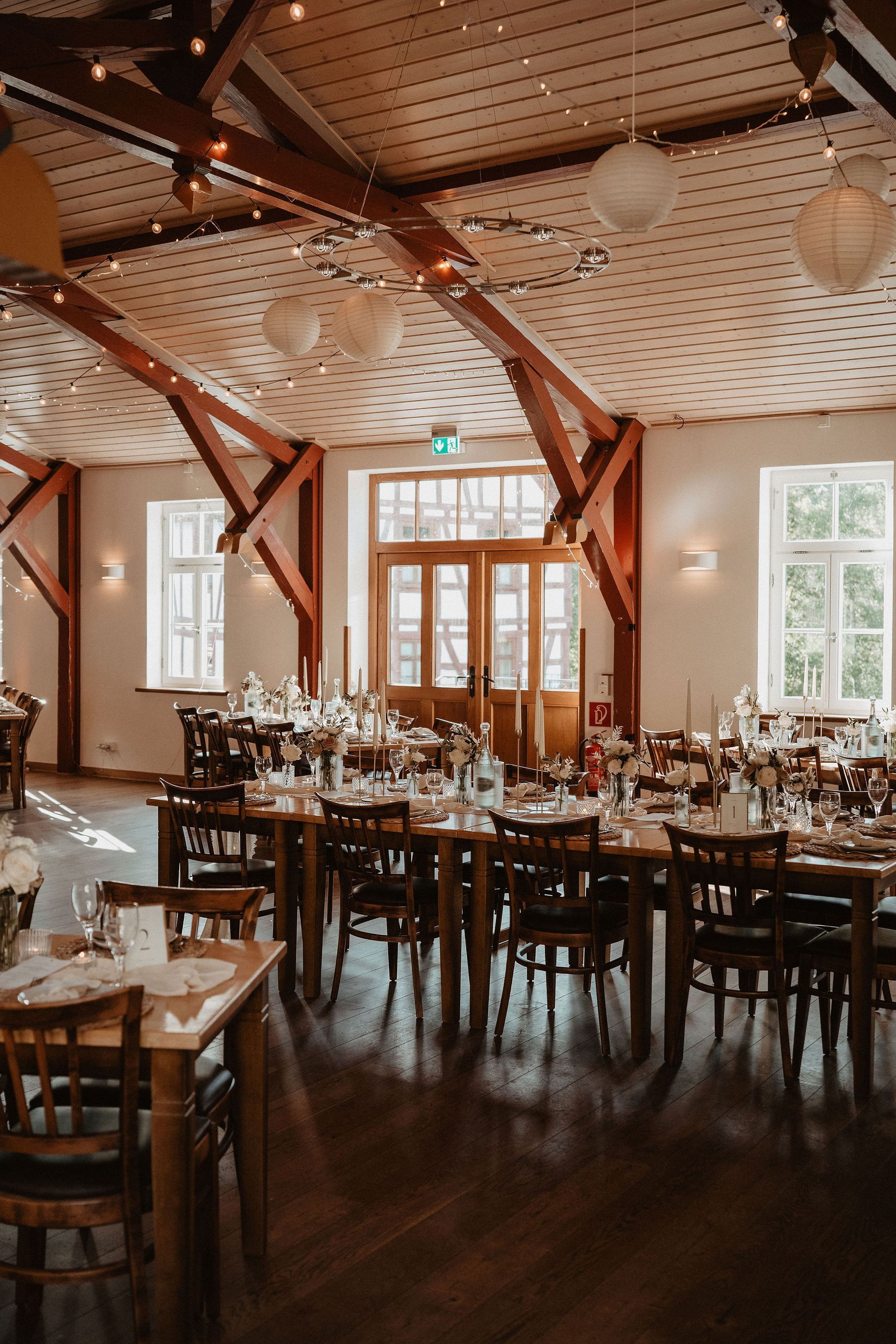 Das Dekorationkonzept auf dem Bild besteht aus Teelichtern in unterschiedlichen Höhen und Stumpenkerzen in Zylindervasen. Die Decke haben wir außerdem noch mit einer Lichterkette verschönert und damit die Balken des Saals in Szene gesetzt.🥰