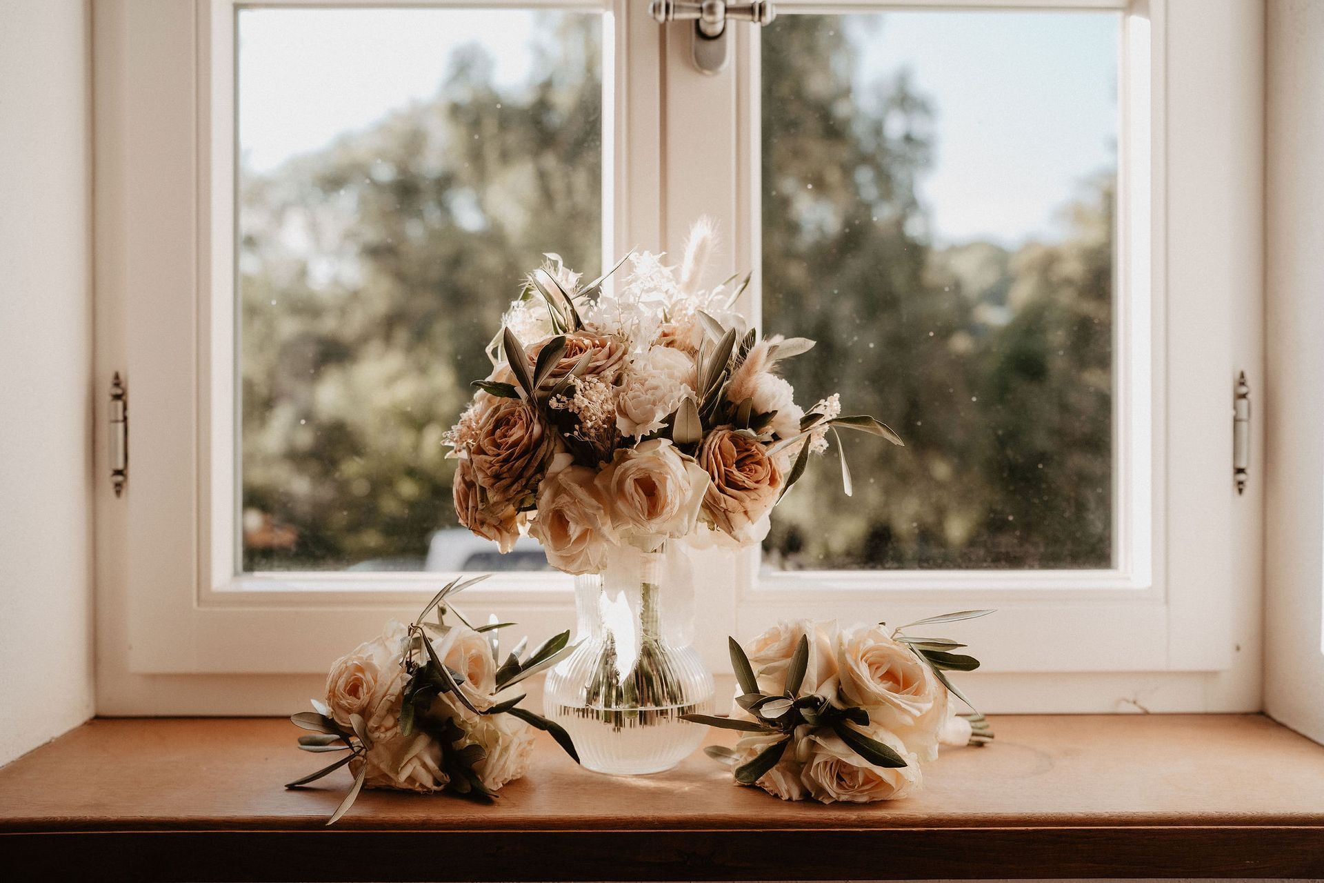 Auf Anfrage kreieren wir euch auch gern einen passenden Brautstrauß und Accessoires wie Haarkränze, Haarkämme oder Anstecksträußchen.